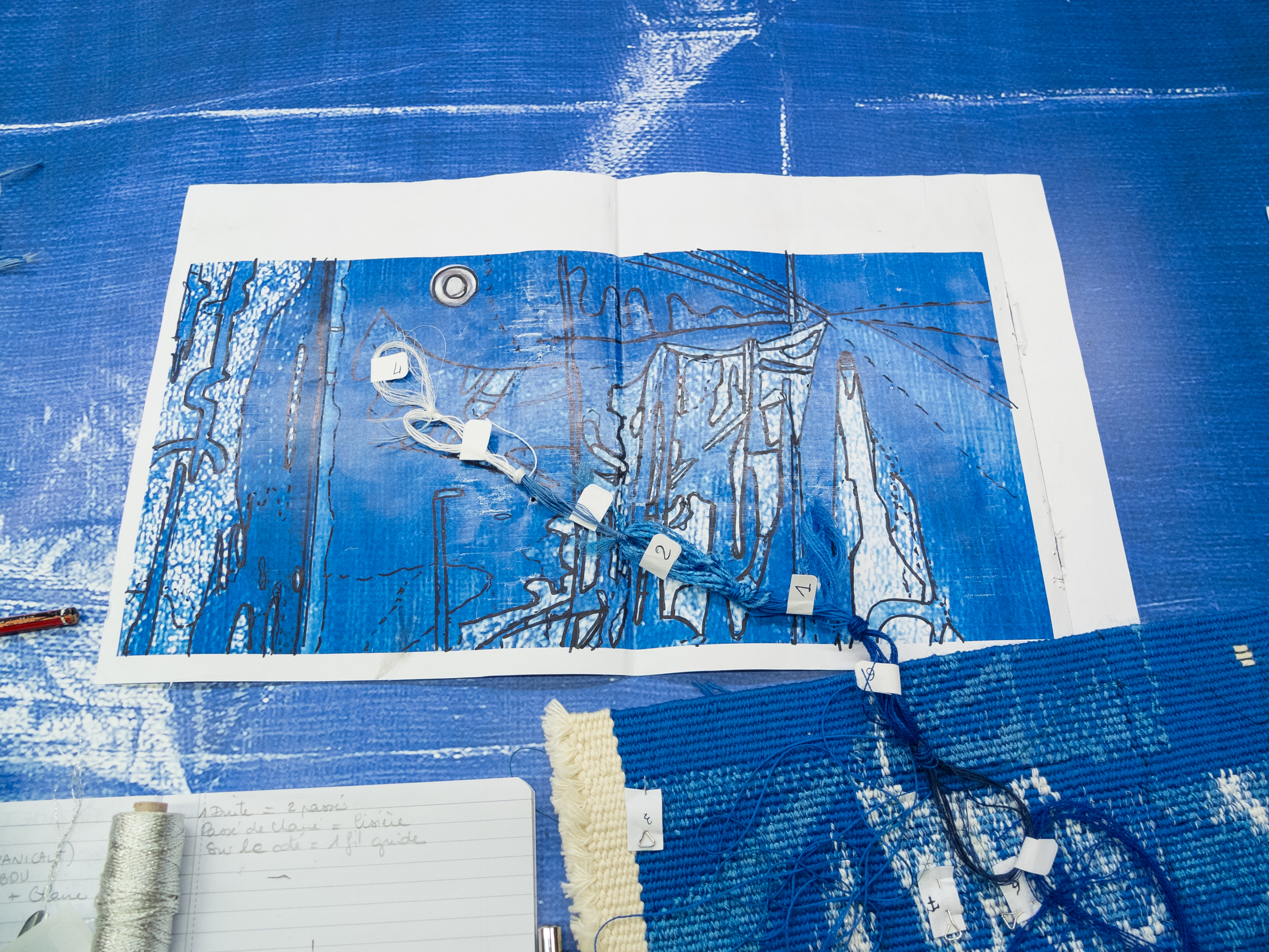Bleue, actuellement sur les métiers Bleue de Marie Sirgue tapisserie contemporaine Le manteau de Capucine Bonneterre Fin de "Bleue" de Marie Sirgue
